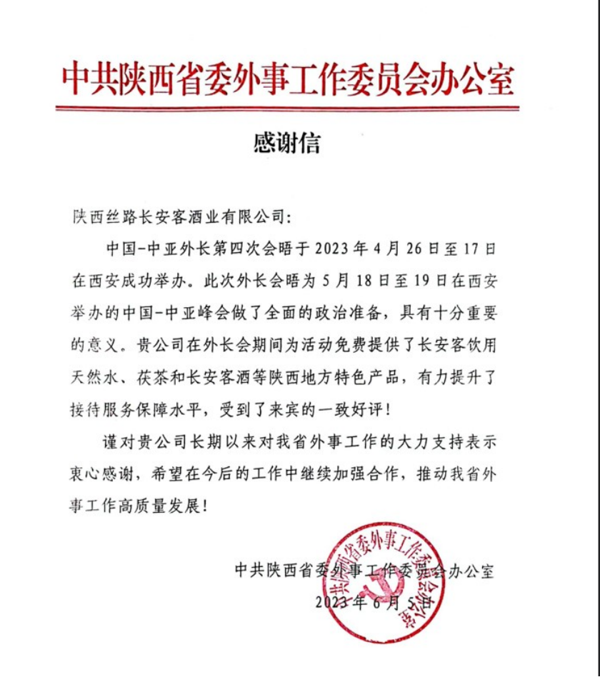 自籌備工作啟動以來,陜西絲路長安客酒業有限公司堅決落實陜西省委省政府工作部署要求,牢記“國之大者”,勇擔光榮使命,以最高標準、最硬作風、最佳狀態、最美面貌服務保障峰會,為所有國內外來賓免費提供了長安客飲用天然水、長安客牌獲茶、長安客酒等陜西特色產品,品種豐富、口感佳、包裝精美,得到各方來賓的高度贊譽,在國內乃至國際社會受到廣泛好評。