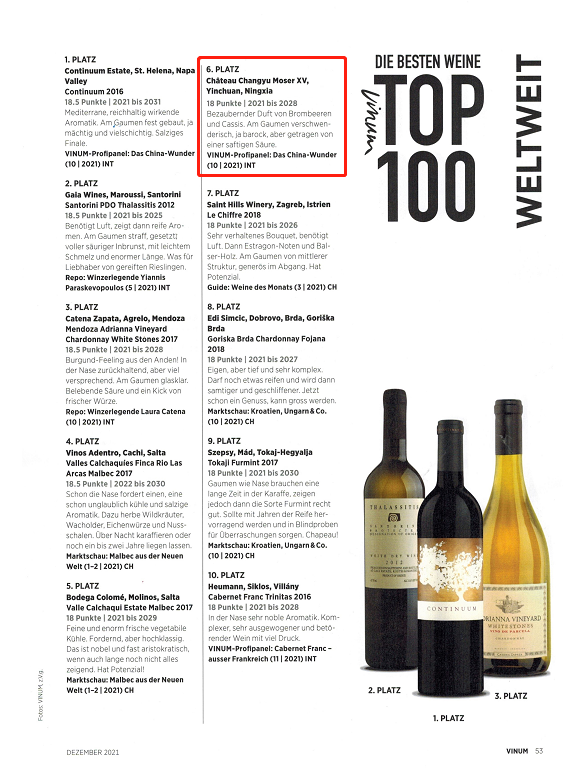 ▲龍諭入選Vinum雜志“世界100瓶頂級葡萄酒”榜單