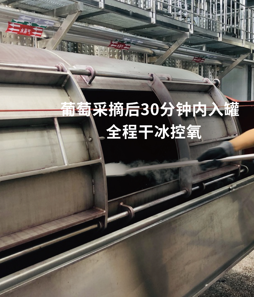 葡萄采收后全程干冰保護(hù),30分鐘內(nèi)進(jìn)入發(fā)酵罐,最大程度減少葡萄汁的氧化和香氣損失。