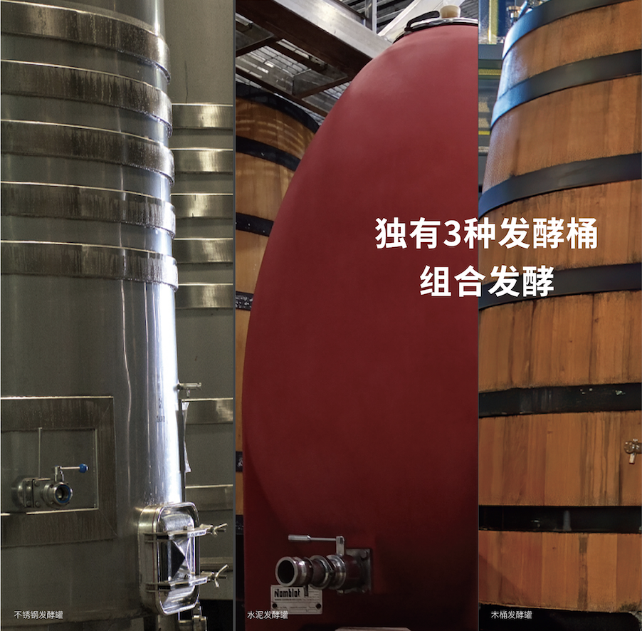 發(fā)酵時(shí),丁洛特酒莊選用橡木桶、不銹鋼罐和蛋形水泥罐三種發(fā)酵罐,各取所長(zhǎng),把葡萄的潛力充分發(fā)揮出來(lái)。