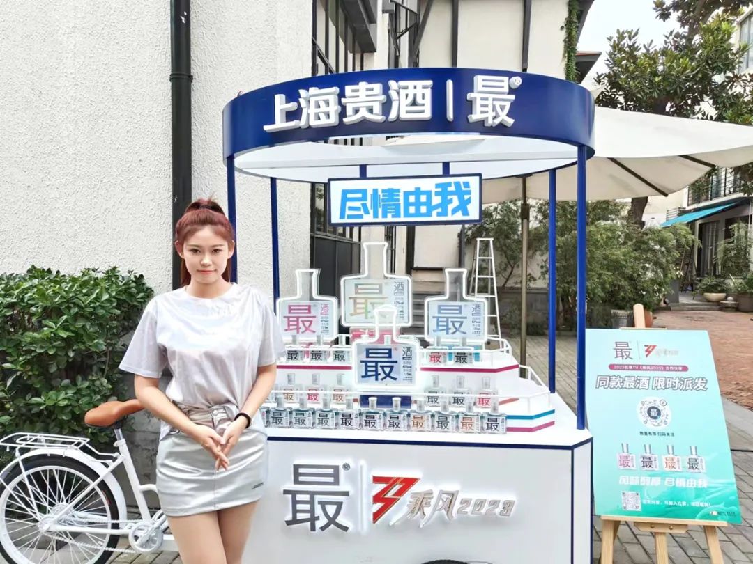 除了深度融入市集活動,上海貴酒·最?酒也借助餐飲門店發起一波巧妙引流。作為《乘風2023》合作伙伴,最?酒在節目熱播期,聯合上海11家知名餐飲門店,開啟了“姐姐同款打卡計劃”,通過線下《乘風2023》合作物料以及線下餐飲場景的露出,強勢促進流量轉化以及銷售提升。