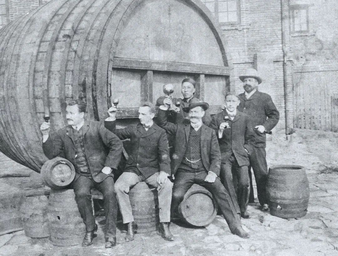 張?jiān)J兹慰偨?jīng)理張成卿(第二排左一)與眾多釀酒師舉杯慶祝中國(guó)第一桶白蘭地誕生。