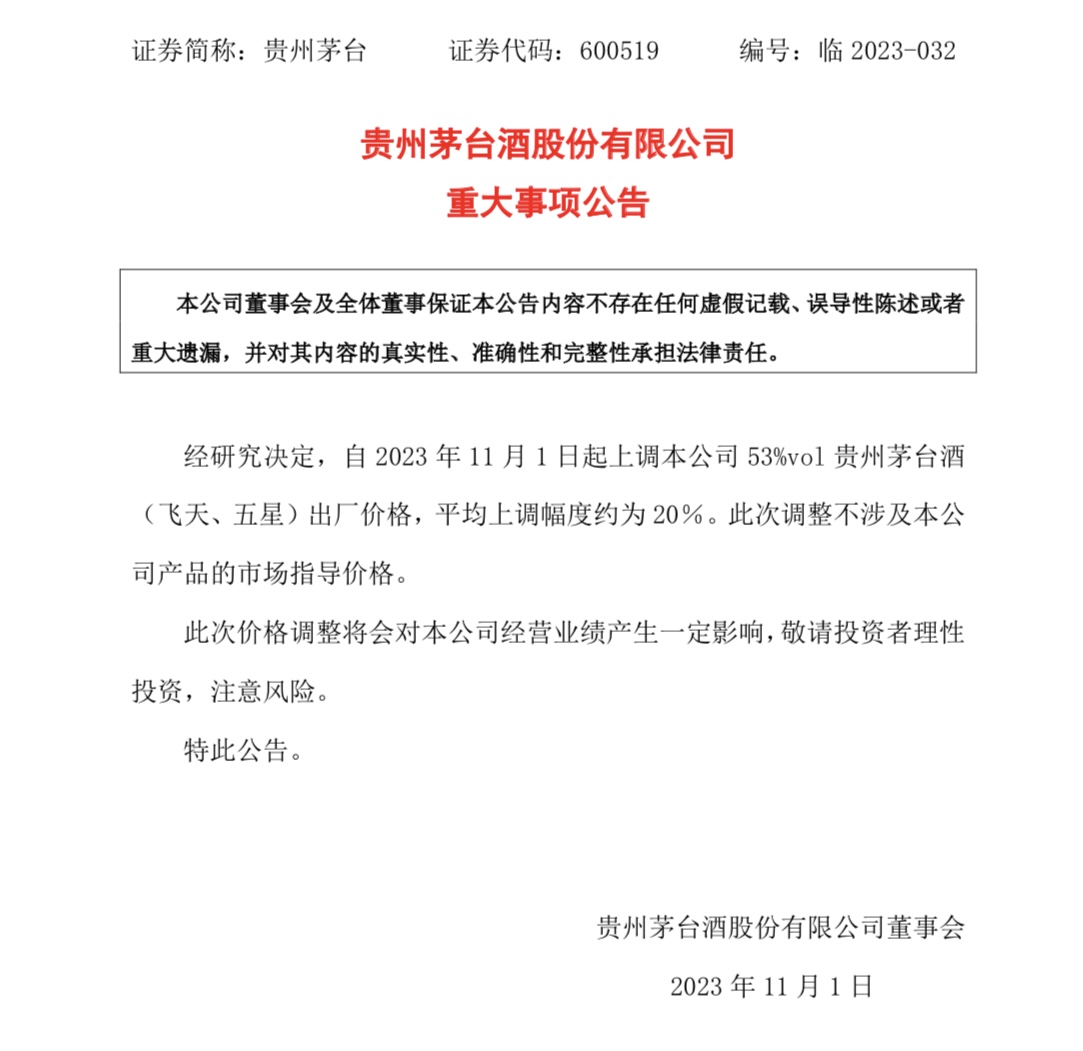 10月31日夜,貴州茅臺發(fā)布公告稱,經(jīng)研究決定,自2023年11月1日起上調(diào)本公司53%vol貴州茅臺酒(飛天、五星)出廠價格,平均上調(diào)幅度約為20%。此次調(diào)整不涉及本公司產(chǎn)品的市場指導(dǎo)價格。據(jù)了解,這是茅臺近6年來的首次提價。截至此次調(diào)價前,飛天茅臺的出廠價為969元/瓶,按照20%漲幅計算,飛天茅臺的出廠價調(diào)整至1163元左右。
