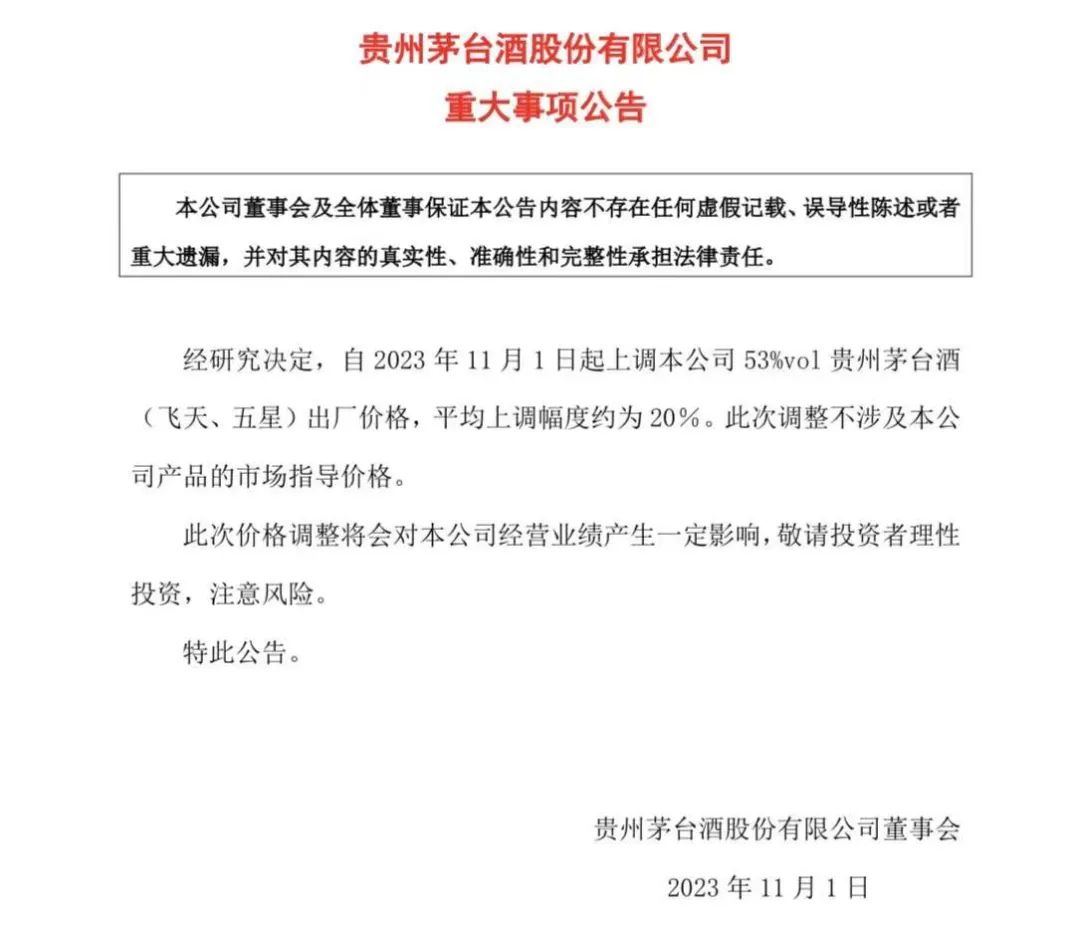 2023年11月1日,一則“貴州茅臺酒股份有限公司重大事項公告”登上熱搜,公告顯示,“自2023年11月1日起上調(diào)本公司53%vol 貴州茅臺酒(飛天、五星)出廠價格,平均上調(diào)幅度約為20%。此次調(diào)整不涉及本公司產(chǎn)品的市場指導(dǎo)價格。”