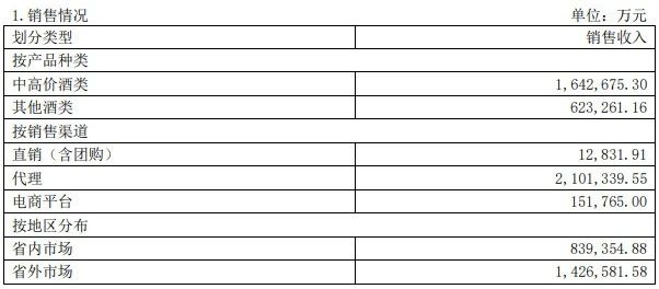 以銷售渠道來看,目前,山西汾酒主要分為直銷(含團購)、代理和電商平臺三種銷售模式,分別實現(xiàn)銷售收入1.28億元、210.13億元和15.18億元。