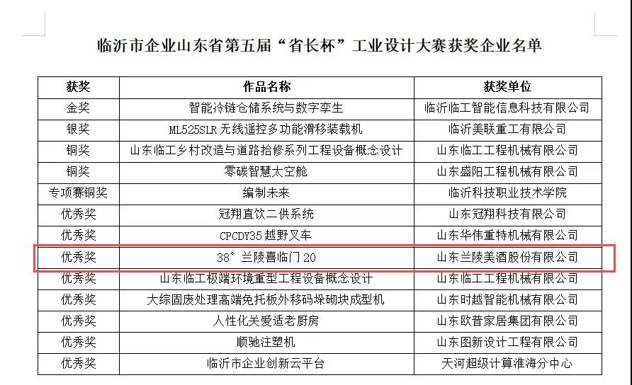 此次大賽,我公司“蘭陵喜臨門酒”在5000多件參賽作品中脫穎而出,榮獲優秀獎。 此次獲獎也是蘭陵縣工業設計大賽領域所獲得的最好成績,實現了“省長杯”工業設計大賽“0”的突破!這一殊榮是對公司喜臨門產品設計創新能力的高度認可,更是對蘭陵美酒堅持匠心精神、推動工業設計與制造業融合發展成果的肯定。