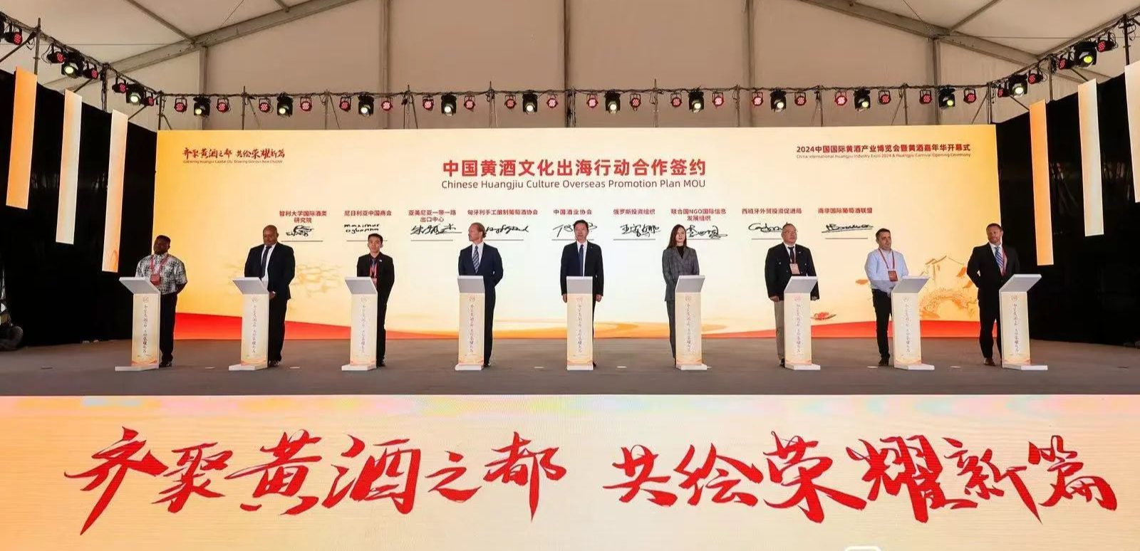 摩爾多瓦駐華使館特命全權大使杜米特魯·貝拉基什先生致辭中表示,摩爾多瓦同樣是一個擁有豐富酒文化的國家,酒不僅是生活中的飲品,更是情感的寄托和文化交流的媒介。本屆博覽會充分展示了紹興黃酒的魅力。雖然中國黃酒和摩爾多瓦葡萄酒在風味和特點上有所不同,但都代表著人類對美好生活的追求和熱愛。他希望通過黃酒博覽會,摩爾多瓦能夠進一步加強雙方文化交流和經貿合作。中國飯店協會會長陳新華在致辭中說,餐酒搭配是現代飲食文化中不可或缺的一部分,能顯著提升餐飲的整體體驗,展現文化內涵,尋求味覺的升華,使餐和酒的文化真正扎根于消費場景。在中國飯店協會舉辦的歷屆星廚文化晚宴中,“黃酒+餐飲”、“美食+美酒”展現出了無限潛力與廣闊前景。面對當下供給新變化、消費新趨勢和跨界新模式的趨勢,“黃酒+餐飲”有望為黃酒產業帶來更加充滿活力、創新和多元化的發展新時代。中國酒業協會理事長宋書玉出席開幕式并致辭。宋書玉表示,合力生于齊聚,榮耀歸于同心,這是中國酒業“創美”與“共美”的不變初心,也是振興中國黃酒必達的使命。產業當下之所興,在傳承與創新、在品質與品牌、在科技與人才、在文化與傳播、在市場與消費、在責任與擔當,更在于科創、文創一體化、產城經濟一體化;產業未來之所興,在于全國化、國際化開拓,在于年輕化、時尚化“破圈”,在于高端化、個性化擴展,在于產業化、數智化融合。黃酒承載著中華民族的文化自信,肩負著向世界傳播中國酒文化的使命,以黃酒博覽會為契機,攜手推動黃酒文化的傳承與發展,讓這份珍貴的文化遺產在世界舞臺上綻放出更加絢麗的光彩。在發布簽約環節,大會以視頻的形式回顧了紹興黃酒“三十載匠心筑夢,國粹黃酒譜新篇”的發展歷程,展示了紹興黃酒重大科技項目階段性成果,進行了“千年運河 萬里酒香”浙東運河(越城段)的傳承與發展推介。紹興市副市長魯霞光、浙江廣播電視集團副總編輯陳潔共同啟動了由紹興市人民政府與浙江衛視共同打造的《詩酒中國心》欄目,該節目將通過詩與酒的交融,展現中國黃酒背后深厚的文化底蘊和獨特的美學精神,喚起人們對美好生活的向往和追求。隨著全球化的加速和文化的交流互鑒,中國黃酒逐漸受到國際市場的關注和青睞,吸引國外嘉賓慕名而來。中國酒業協會秘書長何勇,智利大學國際酒類研究院代表科文納·悉尼,尼日利亞中國商會會長麥克妙斯,亞美尼亞一帶一路出口中心代表朱城杰,匈牙利手工釀制葡萄酒協會中國區總裁邵博陽,俄羅斯投資組織駐華代表王安娜,聯合國NGO國際信息發展組織主席李世恩,西班牙外貿投資促進局代表卡洛斯,南非國際葡萄酒聯盟代表馬可·布魯威爾共同簽署了中國黃酒文化出海行動合作協議。紹興黃酒小鎮建設投資有限公司董事長張磊、深圳四季行酒業有限公司CEO鄒紫輝、南京睿郗新材料有限公司總經理王凱旋共同簽約越城酒貿易項目。最后,在全場觀眾的見證下,宋書玉、吳登芬、周和平、王庚年、王喆、劉斌、譚志桂、魏偉、李永偉、魯文革、李慶榮、呂偉剛、田軍、王濤、李建國、丁如興、徐軍、何勇、魯霞光、錢林江等領導和嘉賓登臺,共同為2024中國國際黃酒產業博覽會暨黃酒嘉年開幕!