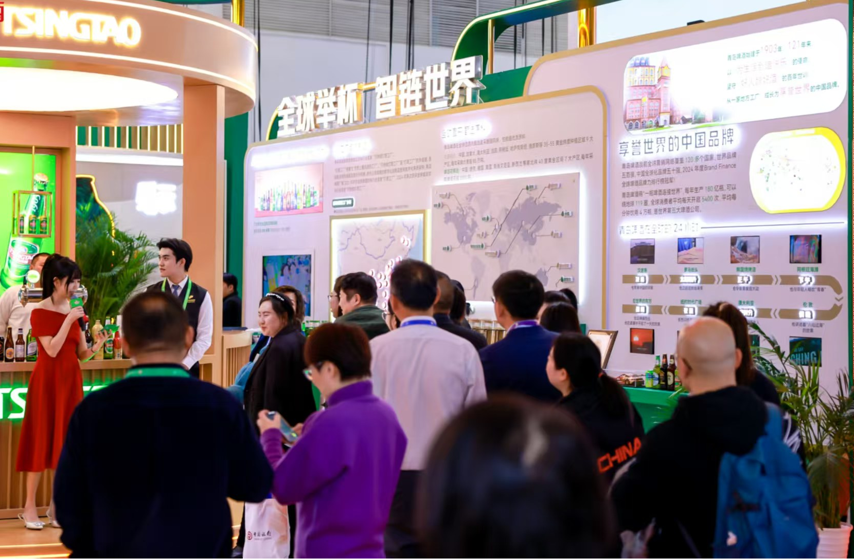 青島啤酒釀酒師、國家啤酒評酒委員江歡大家被團團圍住,他指著展區的兩張地圖,鋪陳了一條生動的鏈條——全球甄選、全球共享的完整供應鏈和產業鏈。