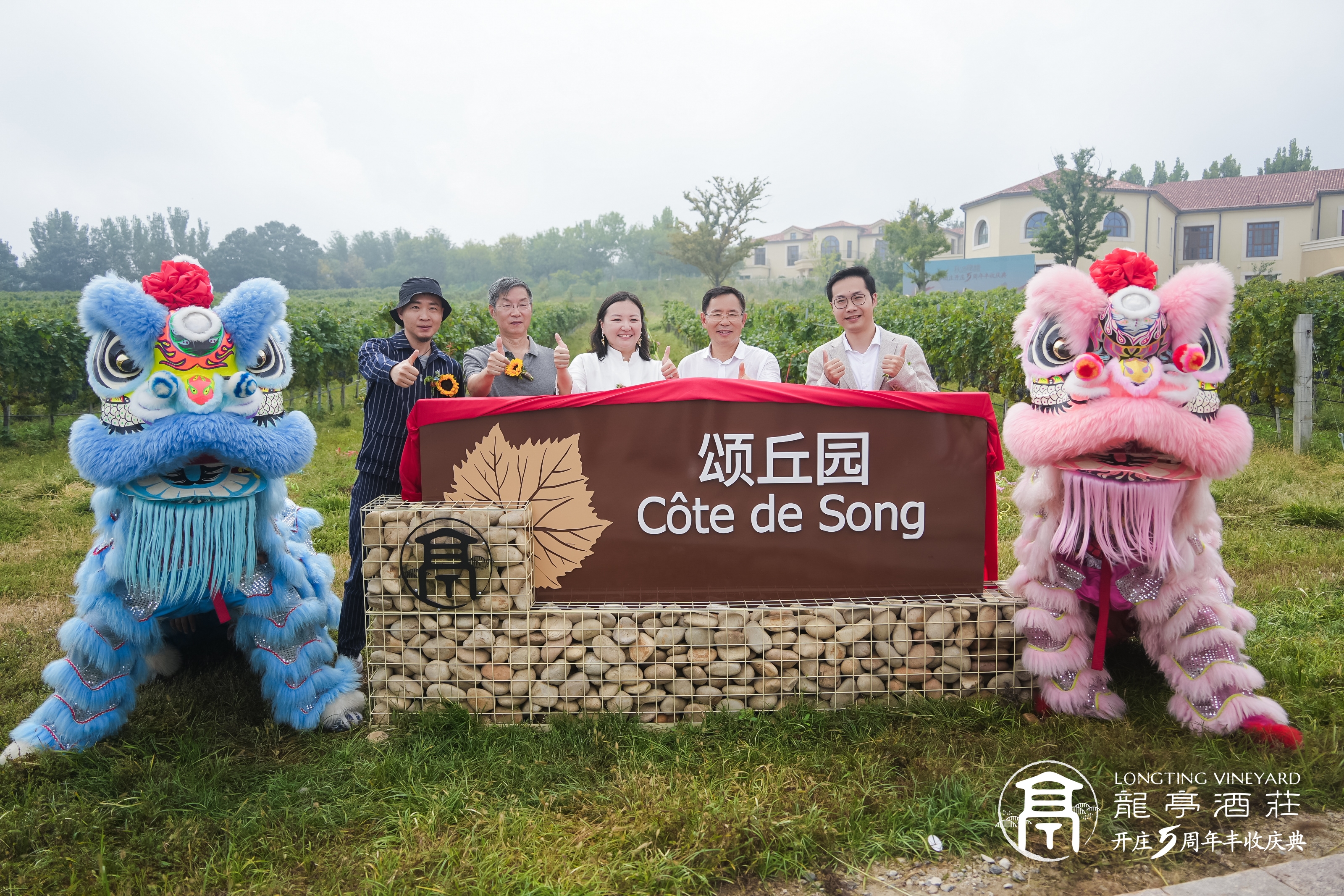 在龍亭酒莊開莊五周年豐收慶典上,酒莊兩位創始人宋妍莊主、王文京先生與眾位嘉賓共同為龍亭酒莊的單一園“頌丘園”揭幕。