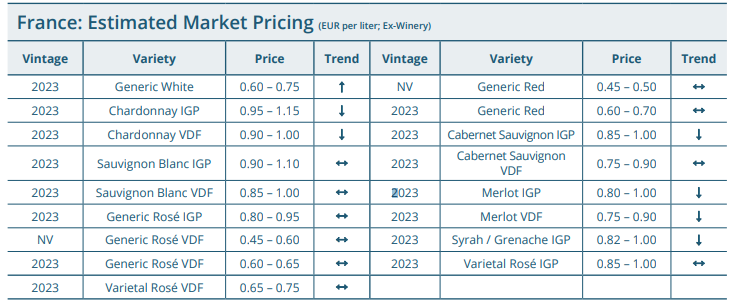 過去兩年,由于收成減少,一些市場上的部分白葡萄酒出現了供需平衡。例如,智利、法國南部、西班牙和南非的供應目前非常有限。紅葡萄酒占全球葡萄酒庫存的大部分,而種植紅葡萄品種的葡萄樹更可能被拔除。2023年歐洲的葡萄收成較低,2024年智利和南非的收成也較低,這將收緊普通白葡萄酒和單一品種白葡萄酒的供應,而這些白葡萄酒的供需平衡已經好于紅葡萄酒。受對白葡萄酒需求的推動,西班牙1-5月的葡萄酒出口總額增長了3.6%,智利1-6月的葡萄酒出口總額增長了14.1%。意大利白葡萄酒在出口方面繼續表現良好:2023年,IGT灰比諾已售罄;2024年1-7月,普羅賽克的裝瓶量增長了5.7%。由于擔心成本上升、消費者的消費習慣發生變化,以及零售商和分銷商似乎仍在去庫存,世界各地的買家一直在繼續保守地削減入貨量。但對于那些能夠確定潛在銷售增長領域的買家來說,散裝酒代表著一個極具吸引力的、物美價廉的機會。目前,加州、法國和阿根廷更像是買家的沃土,價格較低的包括加州中央山谷葡萄酒,但也有來自加州沿海地區的知名葡萄酒,非常適合中檔出口項目。Ciatti8月份發布的報告稱,在法國,由于市場放緩,2023年份和無年份葡萄酒的剩余庫存質量水平較高,價格也有所下降,這在未來1-2個月構成了一個真正的機會,而2024年份葡萄酒的價格可能會開始上漲。來自著名勃艮第產區的瓶裝紅葡萄酒和白葡萄酒的價格明顯低于以往,阿根廷庫存有大量較12個月前更低的標準、優質和高端的馬爾貝克葡萄酒。