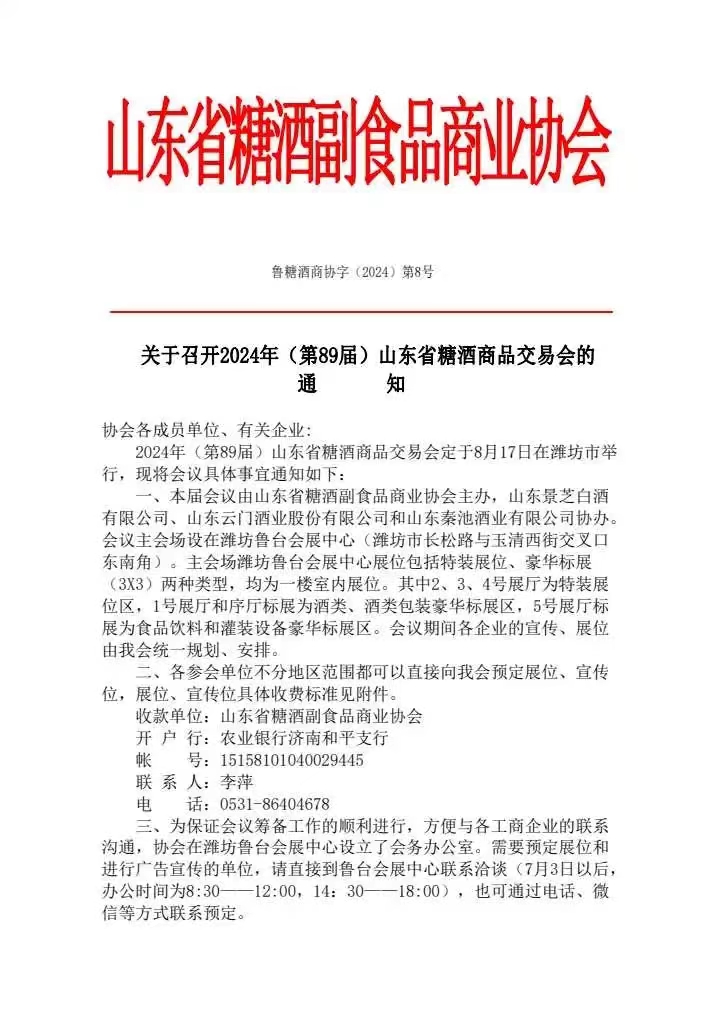 據(jù)悉,2024年(第89屆)山東省糖酒商品交易會定于8月16—18日在濰坊市魯臺會展中心舉辦。
