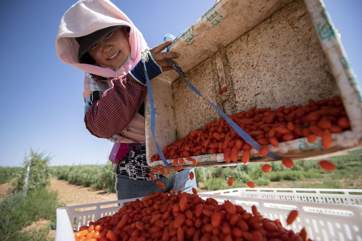 采摘枸杞也是一件“手藝活”。6月份,恰逢枸杞鮮果采摘季,走進勁牌公司中寧枸杞規范化種植基地,一顆顆鮮紅欲滴、肥美誘人的枸杞綴滿枝頭。“這東西叫‘薄皮’,很嬌氣,拿捏力度要剛剛好,稍微多用點力,它就破皮了,裂開了,將來會爛;少用點力,又摘不下來。”正在采摘枸杞的王玉珍操著一口寧夏方言對記者說,“摘枸杞這事兒看起來輕巧,小時候,我們父母都不會讓我們碰的。只有當了幾年茨農,才敢下田去摘。”