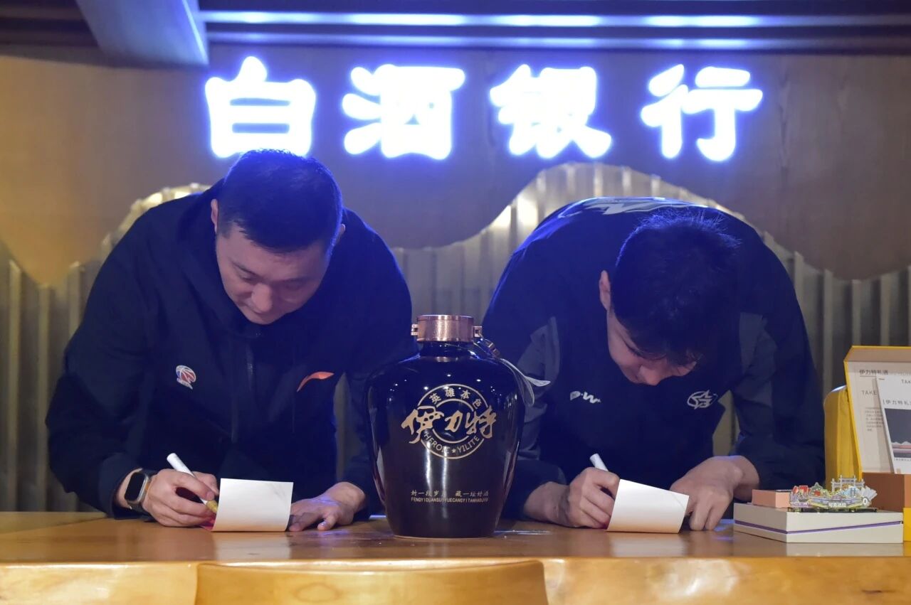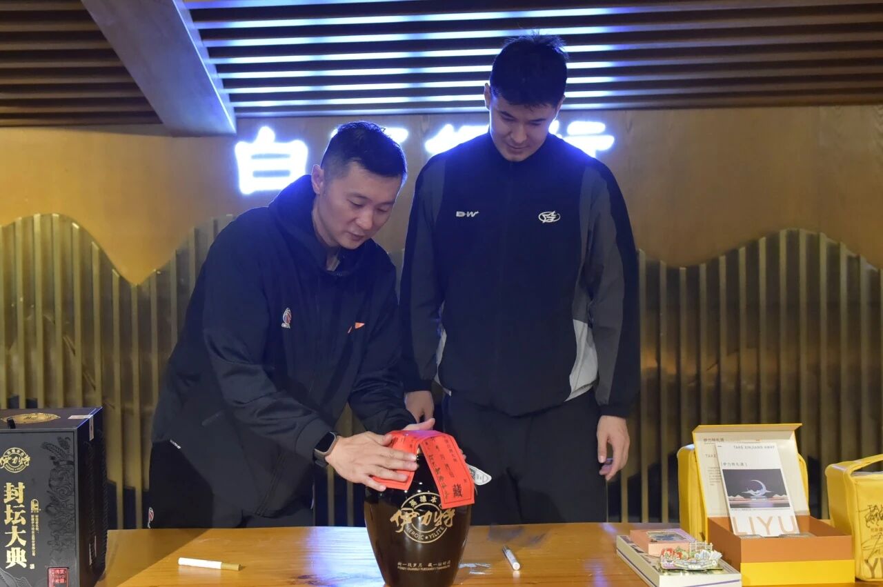 隨后的“酒體勾調(diào)”體驗(yàn)更添趣味。講解員系統(tǒng)講解了白酒勾調(diào)知識(shí)后,隊(duì)員們?cè)诰企w設(shè)計(jì)師的輔助下,調(diào)制專屬“MVP特飲”,一次次調(diào)和、品鑒,如同賽場(chǎng)上的戰(zhàn)術(shù)磨合,耐心與精準(zhǔn)缺一不可。主教練劉煒與隊(duì)長(zhǎng)阿不都沙拉木則代表球隊(duì),將一壇5L封壇酒簽名封存于白酒銀行,這壇酒不僅是此次駐訓(xùn)的獨(dú)特見(jiàn)證,更是象征著體育精神與匠心文化的“時(shí)光沉淀”。