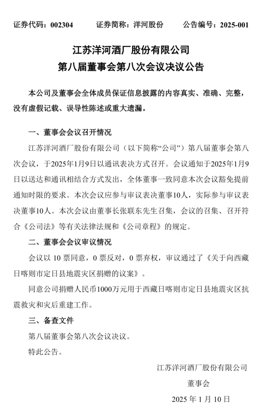 1月9日,洋河股份發布公告稱,董事會審議通過了《關于向西藏日喀則市定日縣地震災區捐贈的議案》,同意公司捐贈人民幣1000萬元用于西藏日喀則市定日縣地震災區抗震救災和災后重建工作。