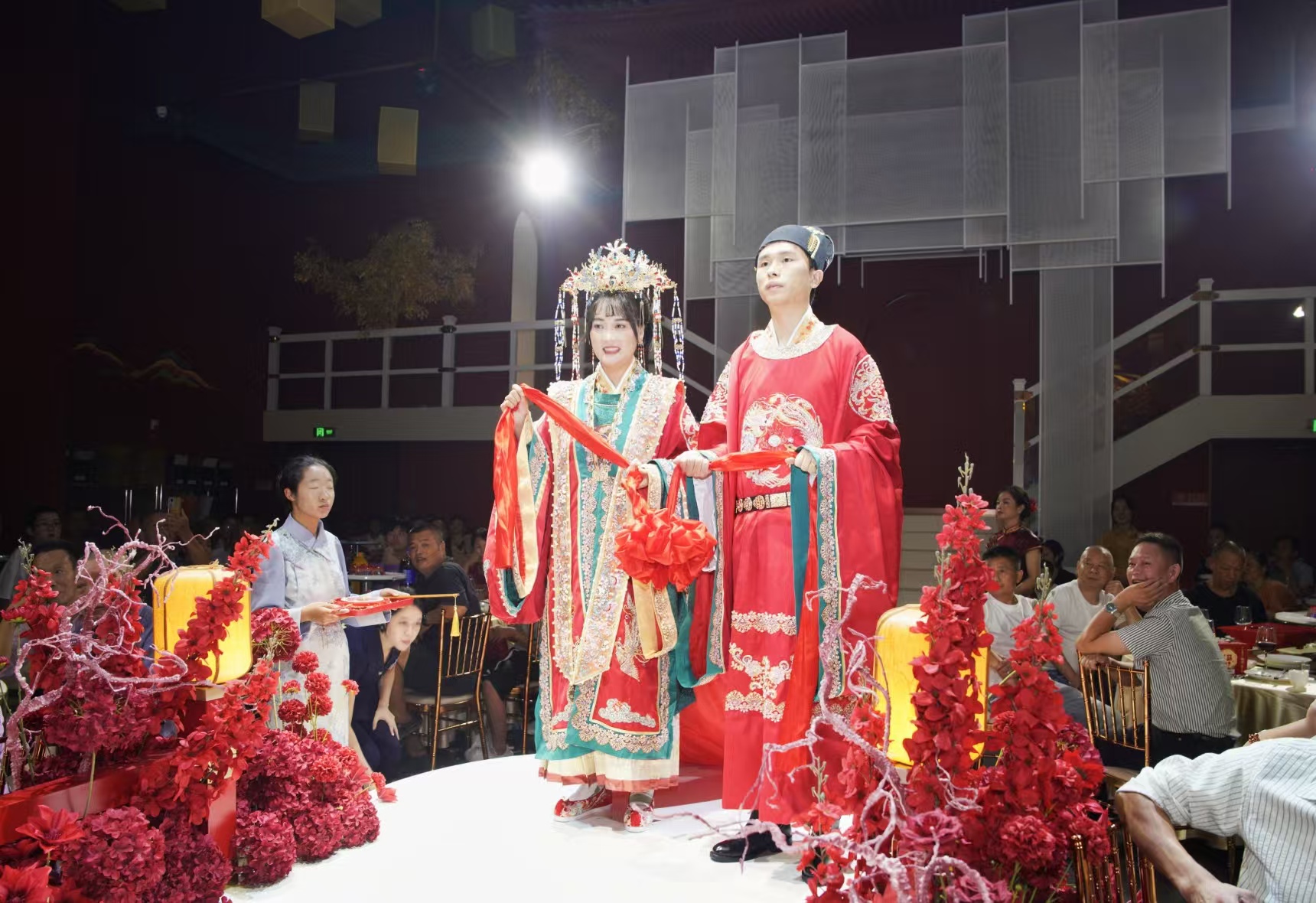 十一期間,大冶市天鵝禮宴中心,掛滿紅綢的大廳彌漫著桂花香。藏族姑娘索朗卓嘎戴上鳳冠,穿上繡有并蒂蓮裙擺的鳳冠霞帔,眼里滿是歡喜。“以前總聽長輩說‘緣分天定’,而我的緣分是‘崗位’牽來的。”她笑著轉頭,正好對上一旁的新郎鄭自國的目光。2025年國慶節,這對在勁牌相識相知的藏漢青年正式結為夫妻。至此,勁牌已有2對藏漢員工喜結連理。