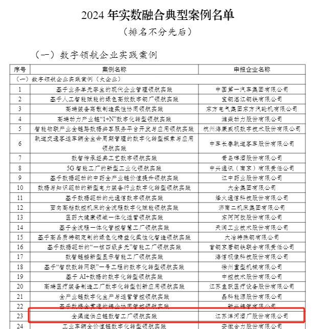 12月31日,工信部發布2024年實數融合典型案例公示名單,江蘇洋河酒廠股份有限公司的“全渠道供應鏈數智工廠領航實踐”入選其中的數字領航企業實踐案例,為宿遷首次入選工信部實數融合典型案例,宿遷市“數字領航”企業實現零的突破。