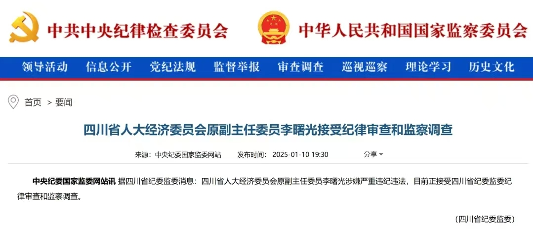 1月10日,據(jù)四川省紀(jì)委監(jiān)委消息,四川省人大經(jīng)濟(jì)委員會(huì)原副主任委員李曙光涉嫌嚴(yán)重違紀(jì)違法,目前正接受四川省紀(jì)委監(jiān)委紀(jì)律審查和監(jiān)察調(diào)查。