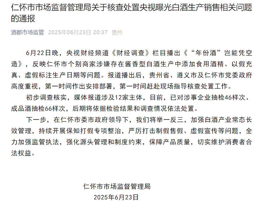 《通報(bào)》顯示,6月22日晚,央視財(cái)經(jīng)頻道《財(cái)經(jīng)調(diào)查》欄目播出《“年份酒”豈能憑空造》,反映仁懷市個(gè)別商家涉嫌存在醬香型白酒生產(chǎn)中添加食用酒精、以假充真、虛假標(biāo)注生產(chǎn)日期等問(wèn)題。報(bào)道播出后,貴州省、遵義市及仁懷市黨委政府高度重視,第一時(shí)間作出安排部署,第一時(shí)間趕赴現(xiàn)場(chǎng)指導(dǎo)核查處置工作。初步調(diào)查核實(shí),媒體報(bào)道涉及12家主體,目前,已對(duì)涉事企業(yè)抽檢46樣次、成品酒抽檢66樣次,后期將依據(jù)檢驗(yàn)結(jié)果和調(diào)查情況依法處置。