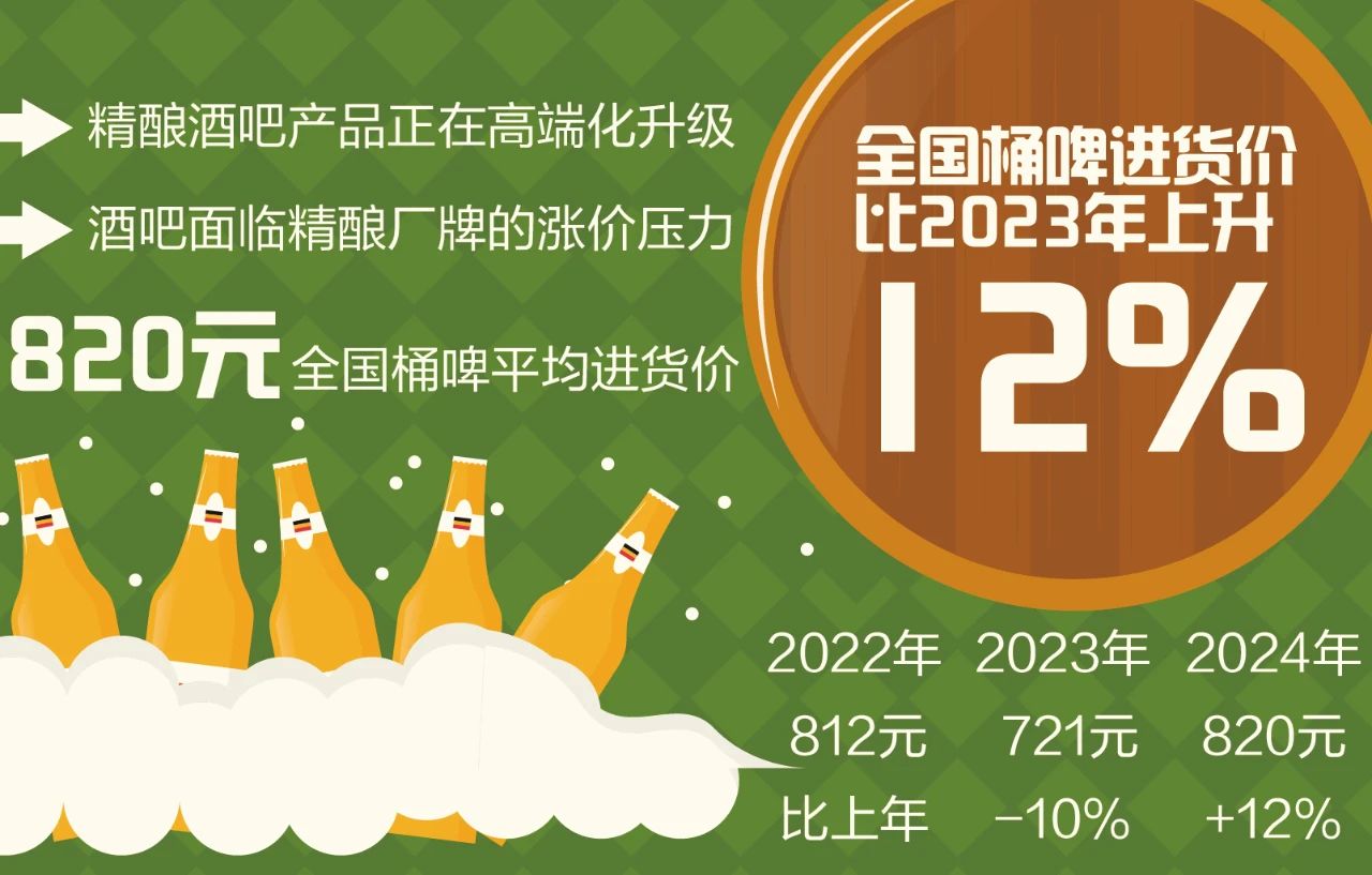 《白皮書》調研顯示,2024年,中國精釀酒吧產品呈現出高端化升級趨勢,酒吧面臨精釀廠牌漲價壓力。調研數據顯示,全國桶啤的平均進貨價為820元,較2023年上升12%。