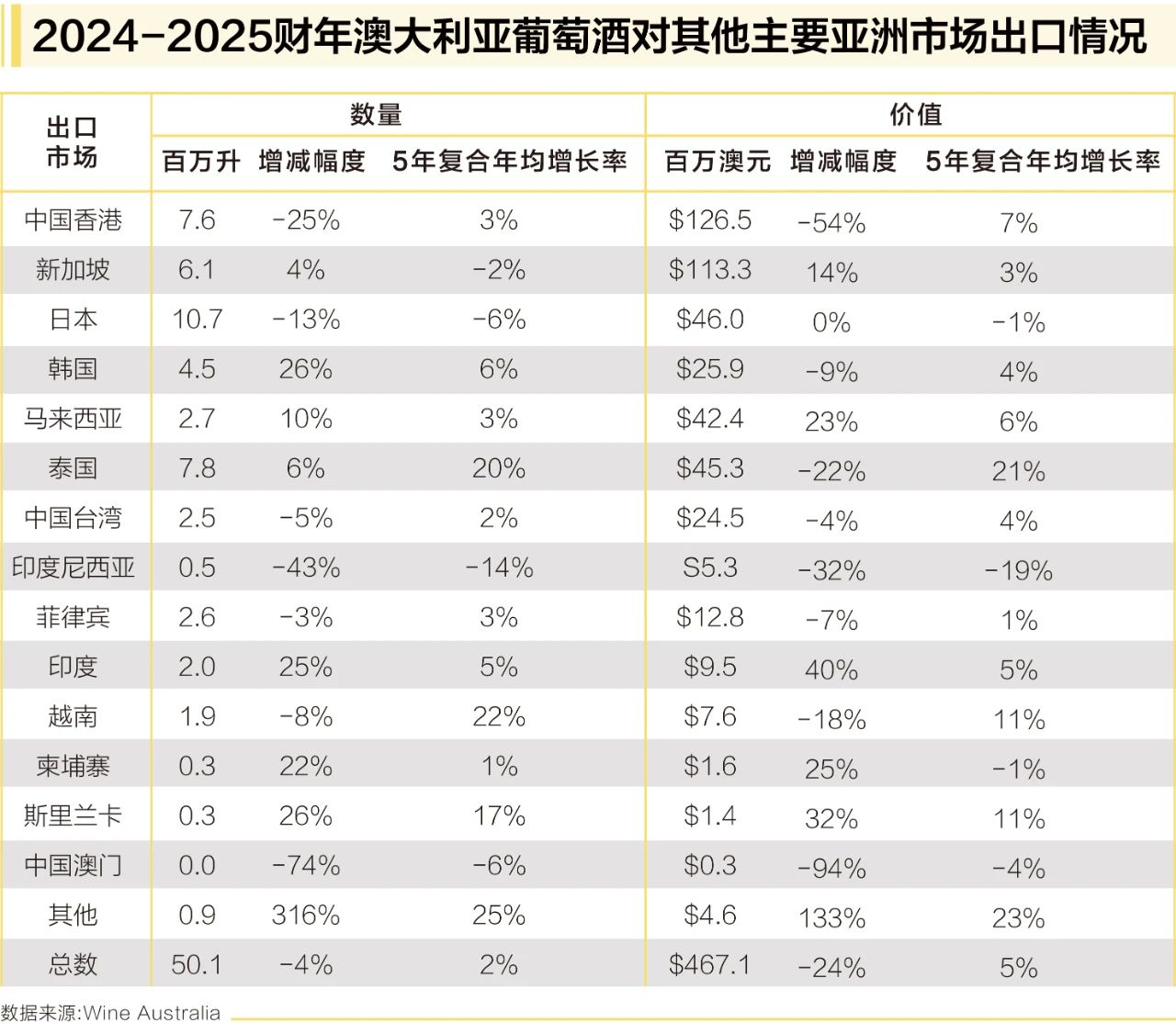 亞洲區域分化尤為顯著:中國香港因轉口功能弱化遭遇量價雙殺,出口量下降25%至760萬升,價值暴跌54%至1.265億澳元;而東南亞整體出口量增長4%,其中,泰國以780萬升實現6%的增量,馬來西亞270萬升增長10%,印度市場更以200萬升創下25%的爆發式增長。