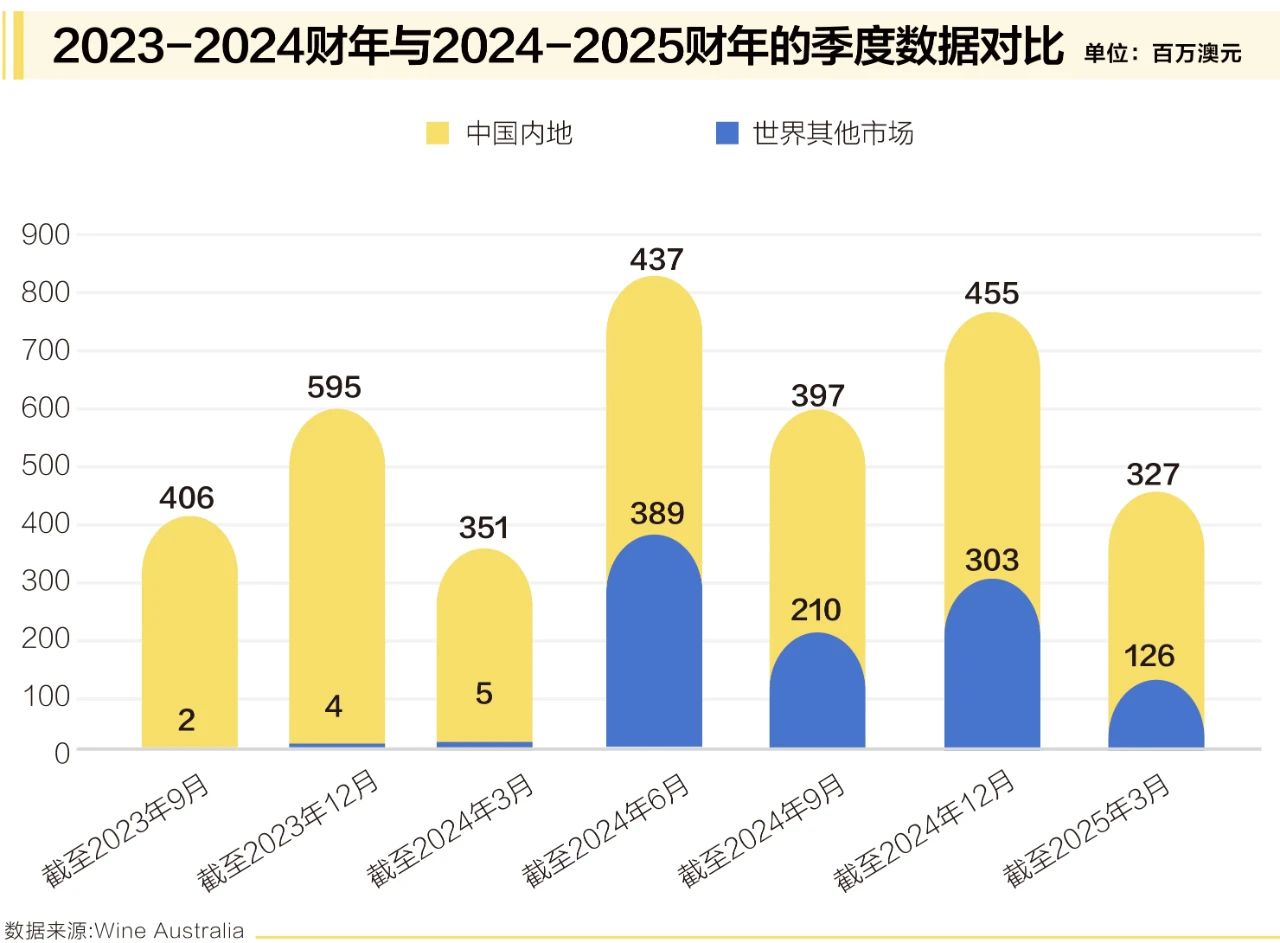 2024年3月,關稅解禁觸發的快速增長,主要源于供應鏈重建的階段性需求。Wine Australia市場洞察經理Peter Bailey指出:“截至2025年6月的季度出口額同比回落35%。”標志著補庫存周期進入尾聲。渠道數據顯示,在關稅取消后的集中補貨階段過后,終端銷售復蘇力度明顯不足。