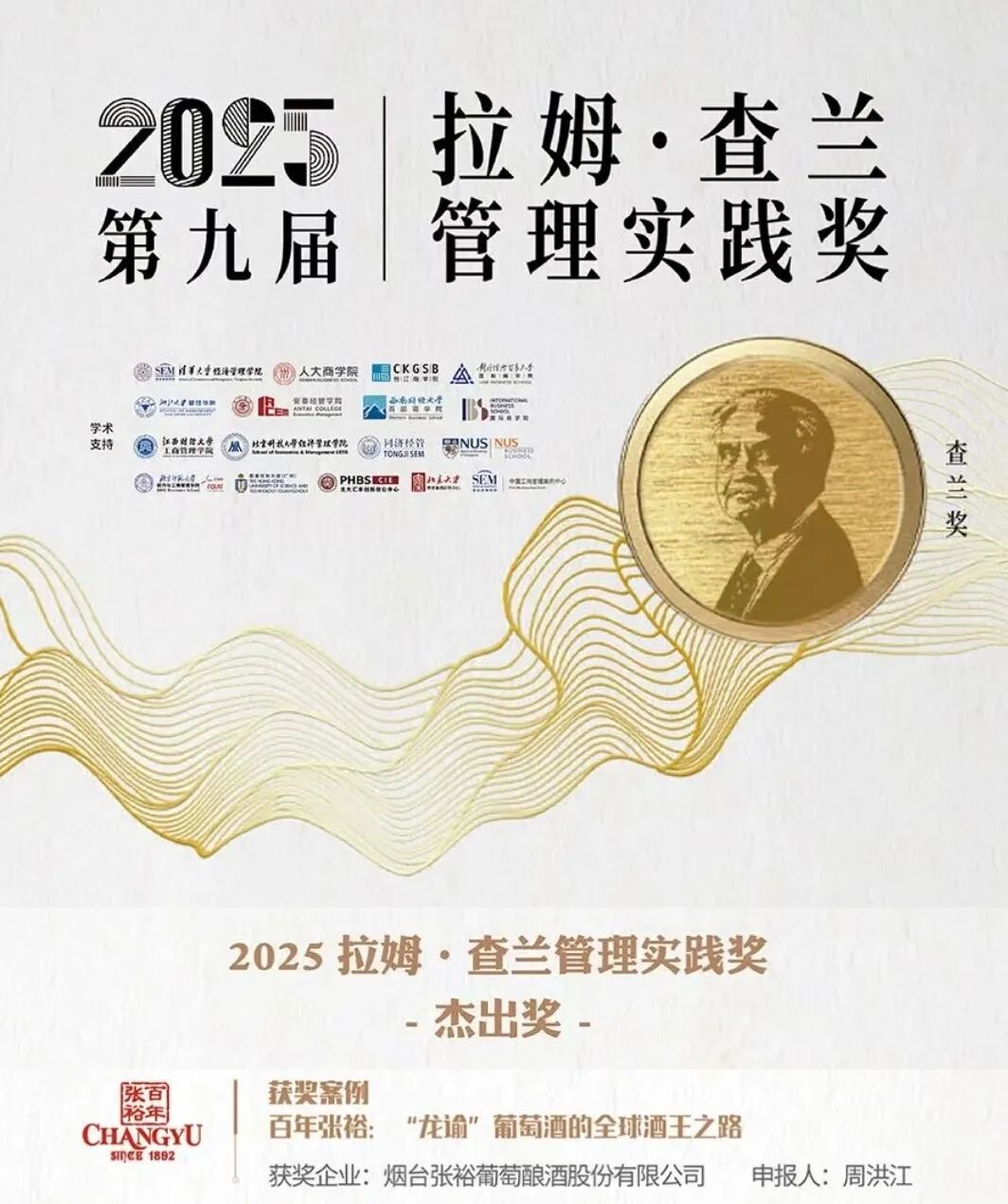 張?jiān)9径麻L(zhǎng)周洪江及其管理案例《百年張?jiān)#骸褒堉I”葡萄酒的全球酒王之路》,從全國(guó)兩百余個(gè)參評(píng)案例中脫穎而出,榮獲“2025拉姆?查蘭管理實(shí)踐獎(jiǎng)-杰出獎(jiǎng)”,并入選哈佛案例庫(kù)。同期入選的還有聯(lián)想集團(tuán)、百勝中國(guó)、極氪中國(guó)等知名企業(yè)。