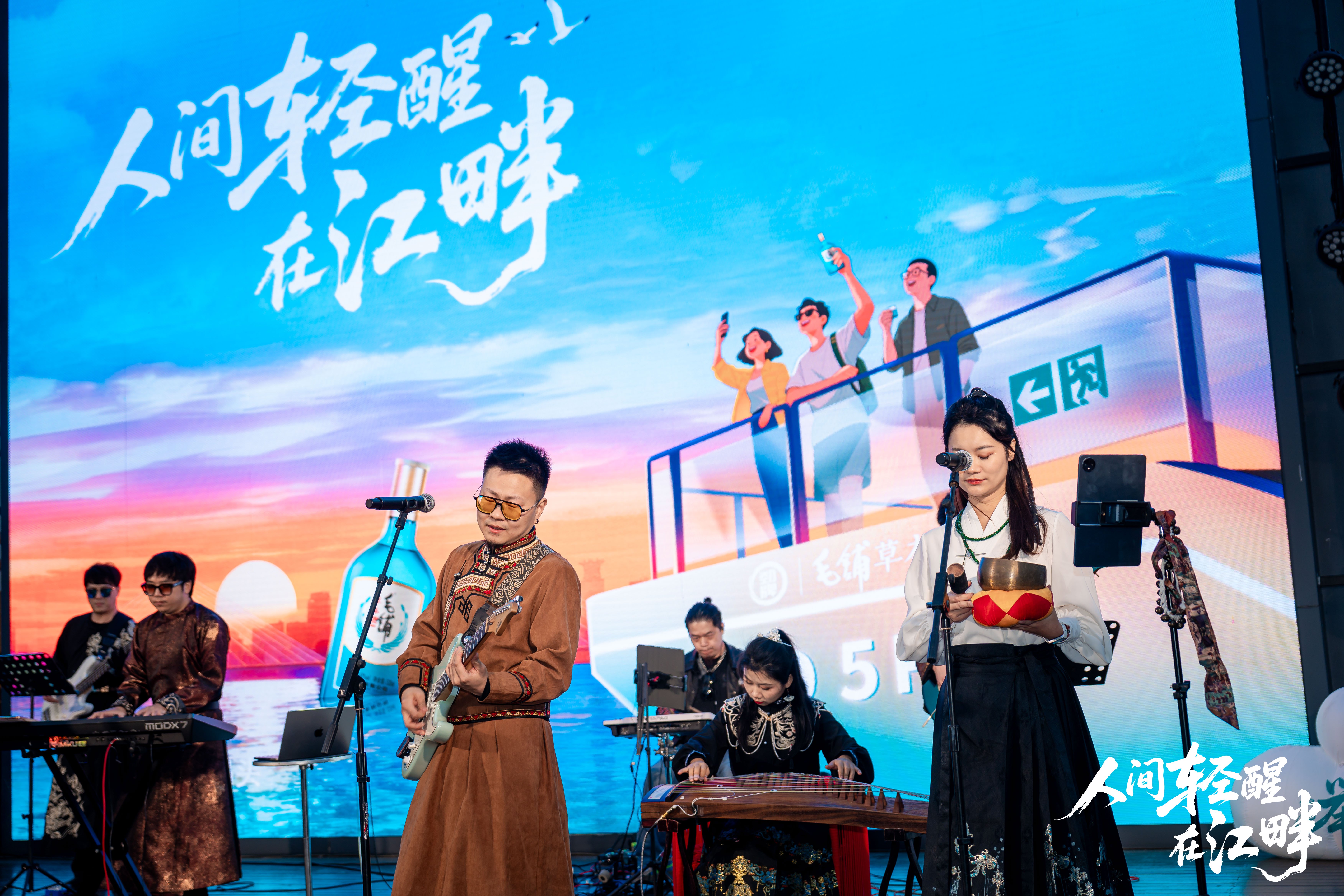 武漢本土樂隊鯨落樂隊用幾首膾炙人口的音樂拉開活動序幕,抖音爆款技能草本舞被搬上碼頭舞臺,帶動觀眾一起舞動,爆笑演繹毛鋪草本酒首部輕喜劇《我在90年代望父成龍》同款舞蹈場景,現場笑聲與江浪聲相映成趣。