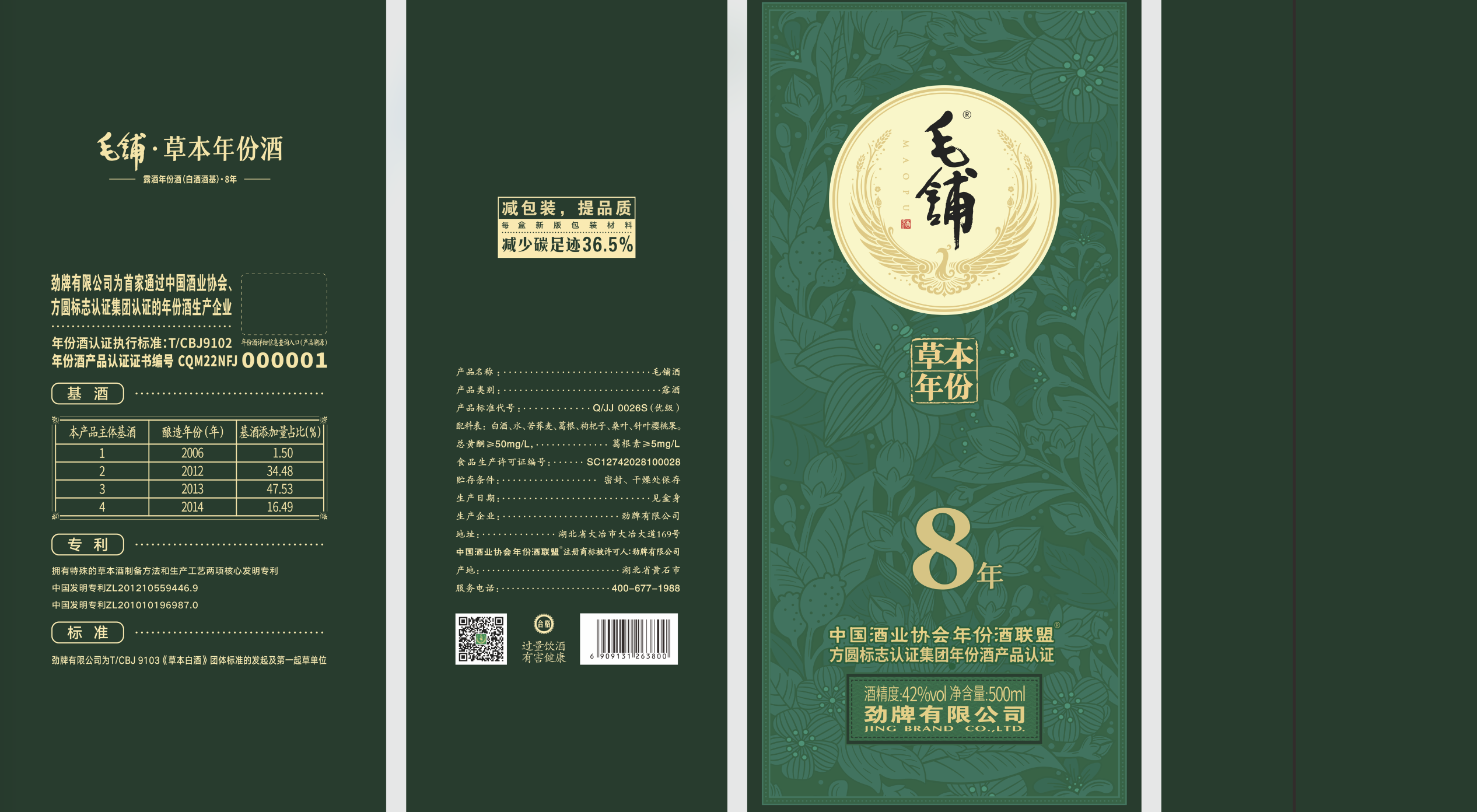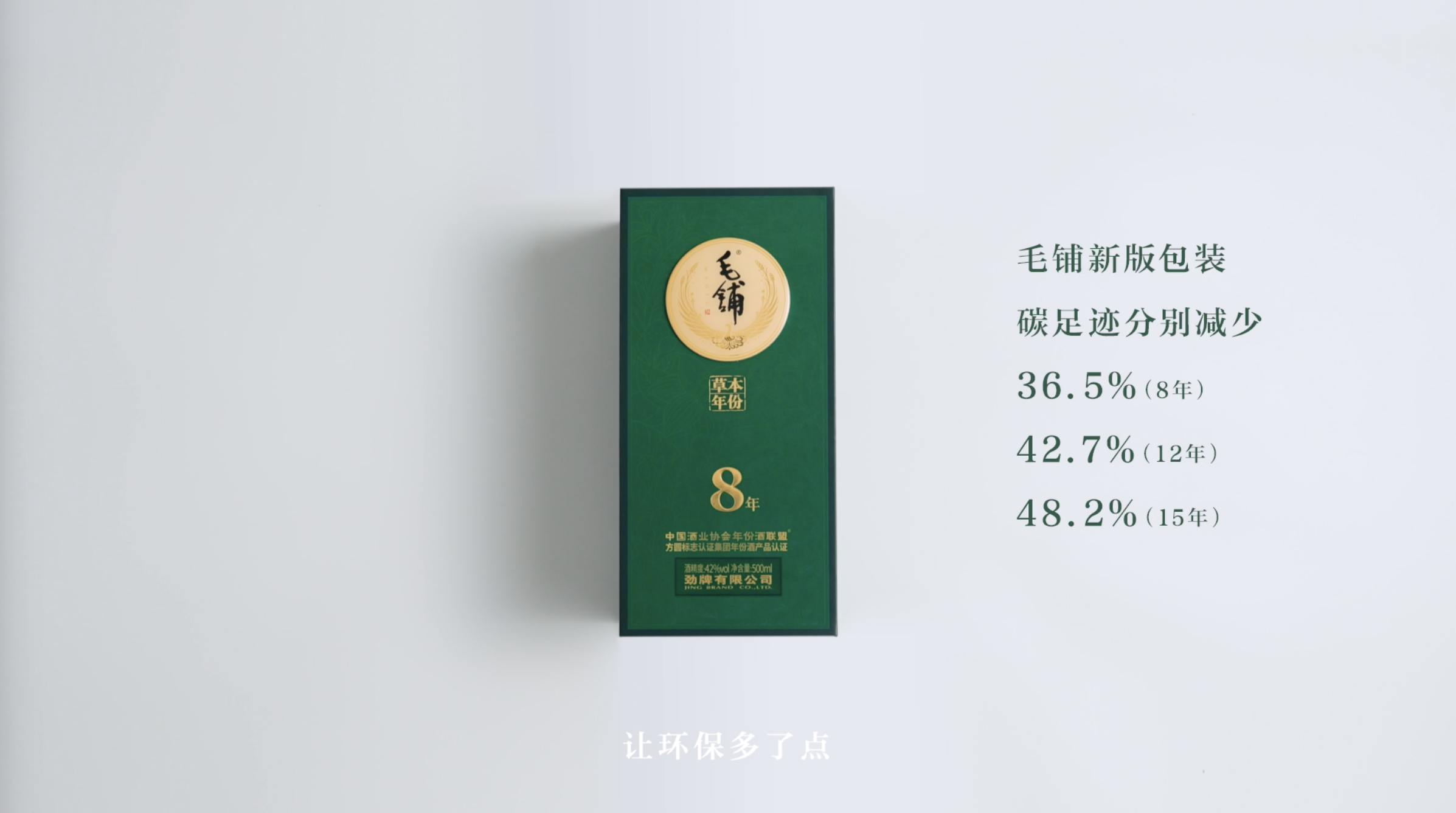 通過工藝的優化與升級,毛鋪草本年份酒實現了不同年份產品碳足跡分別減少36.5%(8年)、42.7%(12年)、48.2%(15年),具像化呈現了毛鋪踐行環保理念與企業社會責任的擔當,讓用戶的每次消費都成為可感知的環保貢獻。