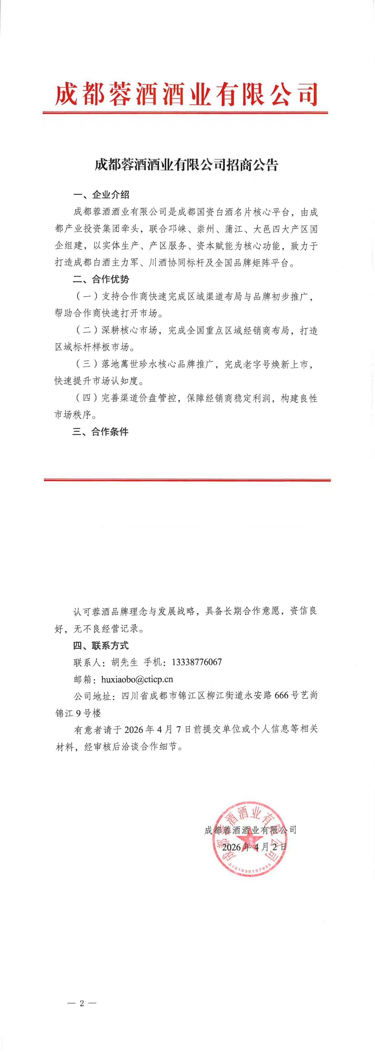 4月2日,成都蓉酒酒業(yè)有限公司(簡稱:蓉酒公司)正式發(fā)布招商公告,面向全國誠邀優(yōu)質(zhì)經(jīng)銷商合作共贏。
