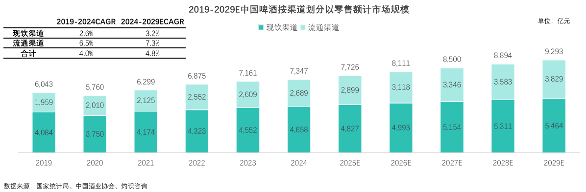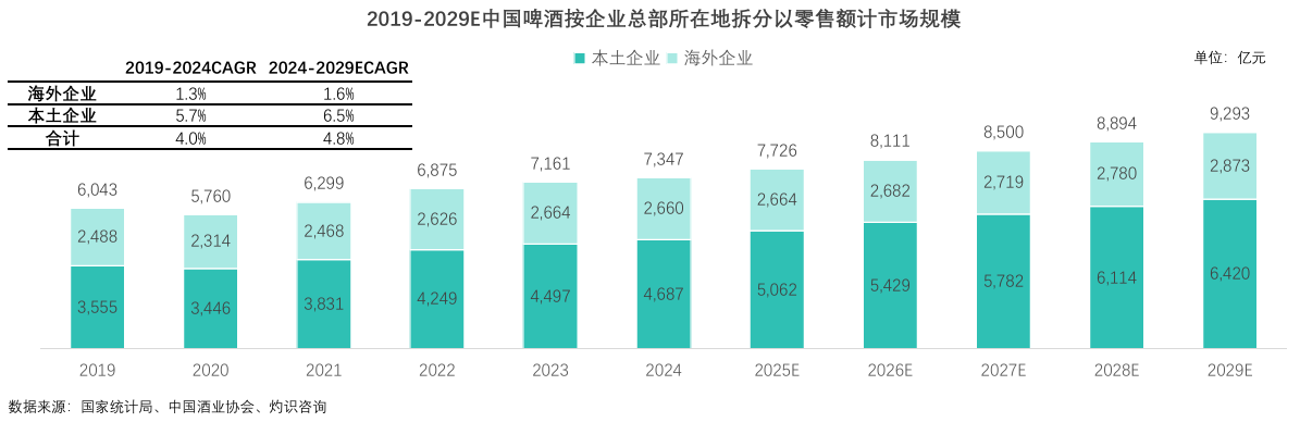 報告顯示,以零售額計,中國啤酒市場規模已從2019年的6043億元增長至2024年的7347億元,復合年增長率為4.0%。展望未來,這一增速有望提升至4.8%,預計到2029年,市場規模將達到9293億元。